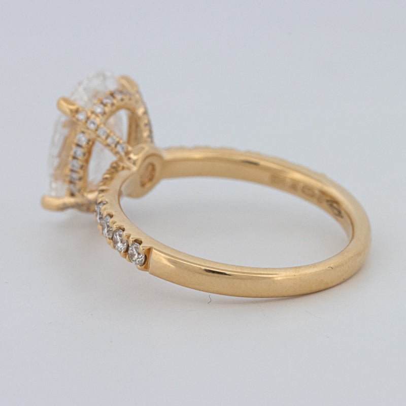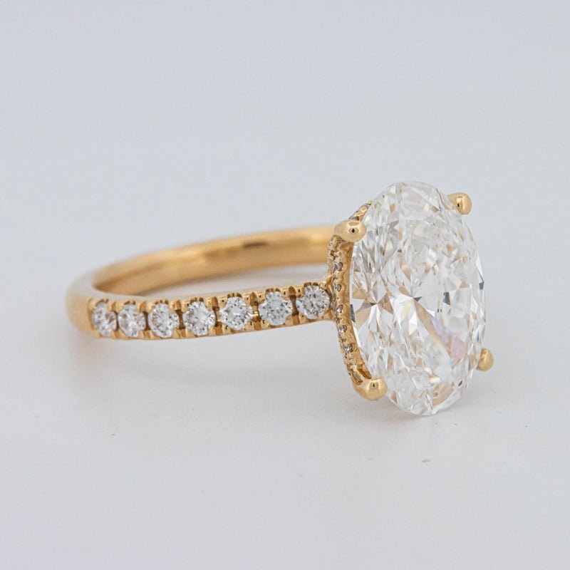 Inelul Pavé Oval „Basket” Sub-Halo prezintă un diamant de 3.08 ct D/VS1 lab‑grown tăiat oval, înconjurat de 0.60 ct de pietre laterale pavé naturale luminoase.html