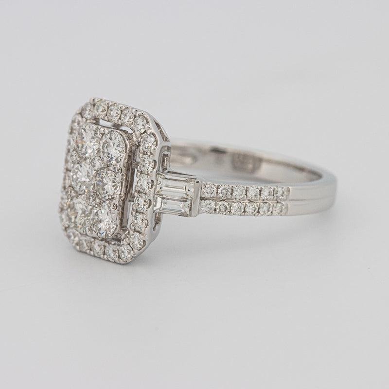 Un centru cu montură invizibilă amplifică strălucirea suprafeței, în timp ce laturile baguette adaugă linii clare și rafinament vintage-întâlnește-modern.