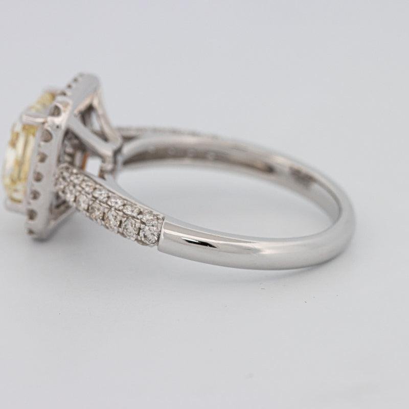 Un centru radiant pătrat Galben Deschis Fancy de 2.18 ct certificat GIA este încadrat de un halo strălucitor F/VS totalizând 1.00 ct pentru culoare și strălucire amplificată.