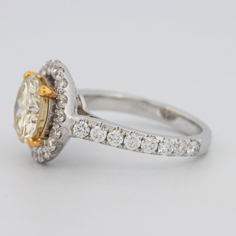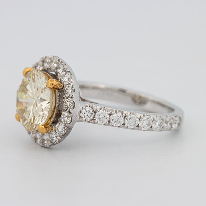 Un centru rotund Galben Fancy de 2.91 ct certificat HRD este încadrat de un halo strălucitor F/VS totalizând 1.25 ct pentru culoare și scintilație amplificată.