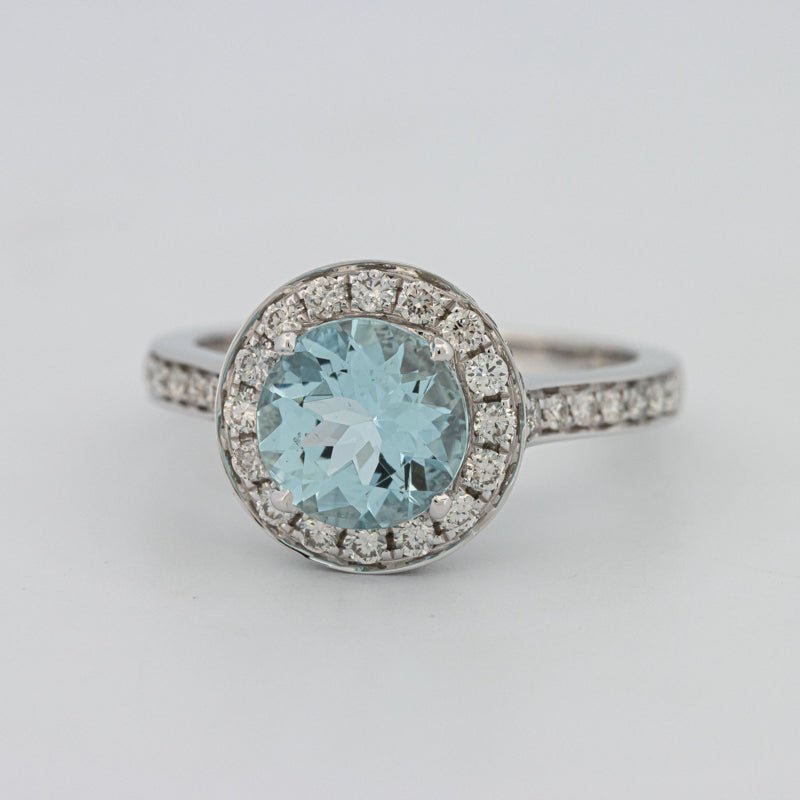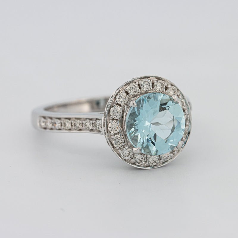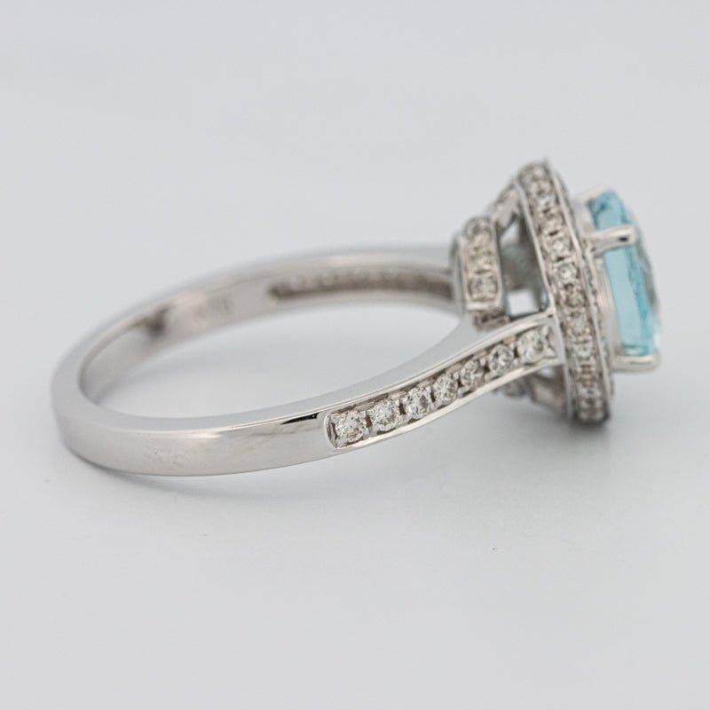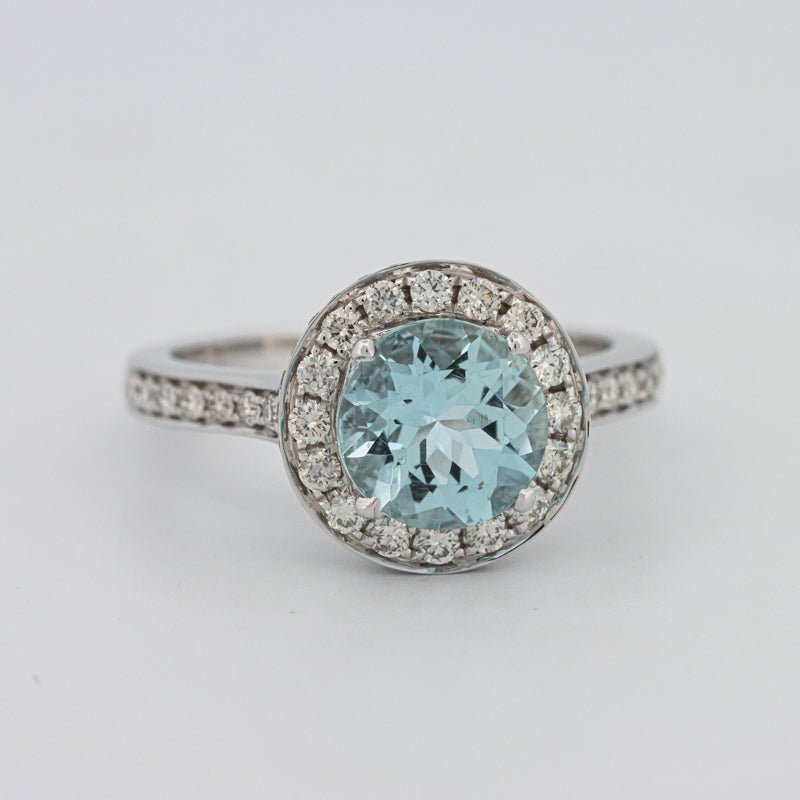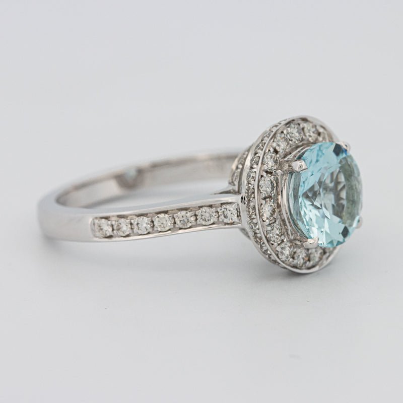 Светящийся аквамарин 1.52 ct является центром изысканного ореола, его морской синий оттенок подчеркивается яркими F/VS pavé.