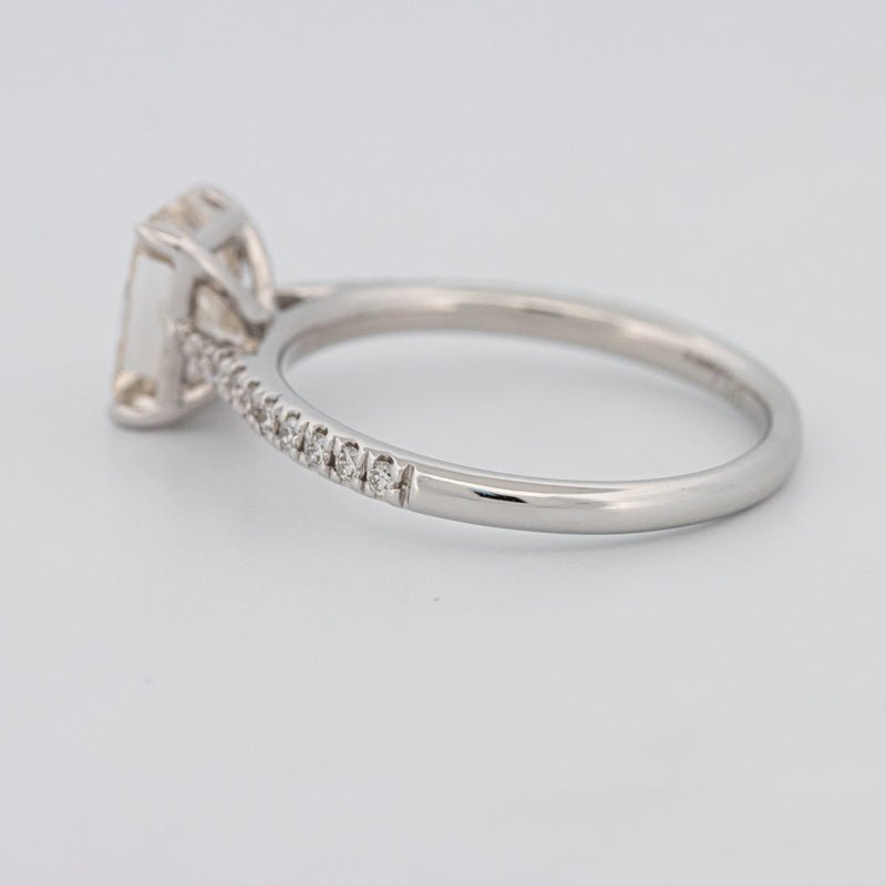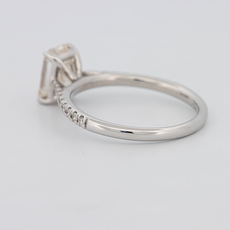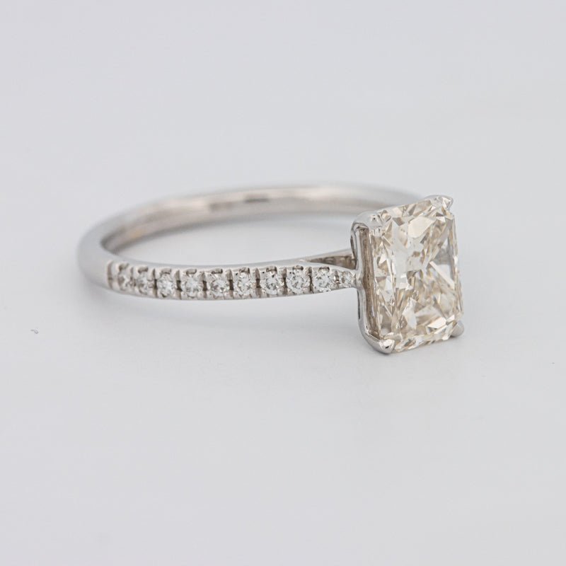Сертифицированный HRD бриллиант 1.50 ct J/SI1 с изумрудной огранкой демонстрирует элегантную геометрию ступенчатой огранки, дополненную изысканным паве.