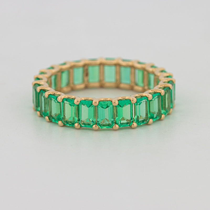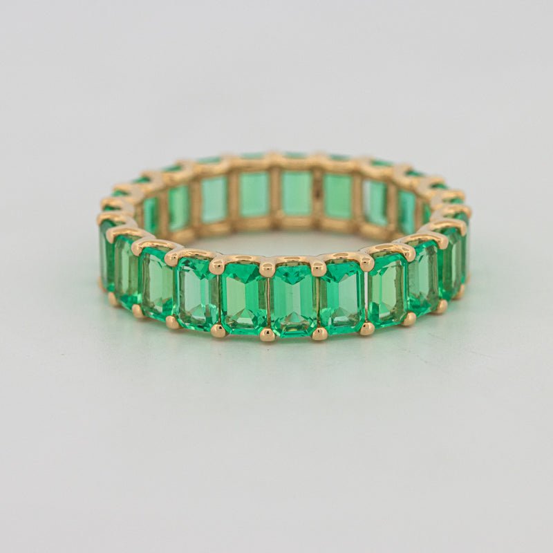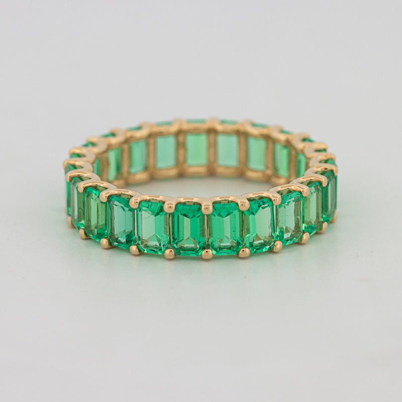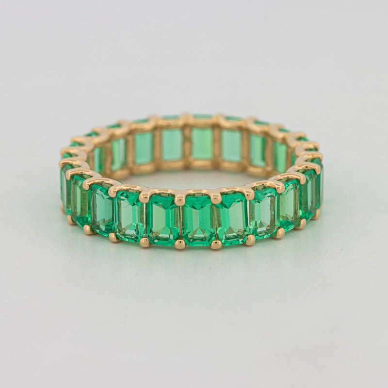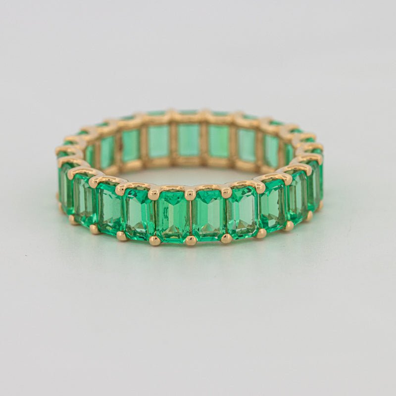 Непрерывный круг насыщенных зеленых изумрудов придает смелый цвет и утонченную симметрию в элегантном, современном профиле.