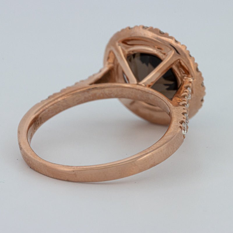 Богатый, дымчато-коричневый кварц диаметром 10 мм является центральным элементом этого кольца с ореолом из паве, его полупрозрачная глубина обрамлена тонким кругом ярких белых бриллиантов.