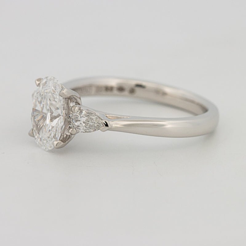 Яркий овал, выращенный в лаборатории и оцененный IGI, занимает центральное место, окруженный четкими натуральными акцентами для сбалансированного блеска трех камней и элегантной симметрии.