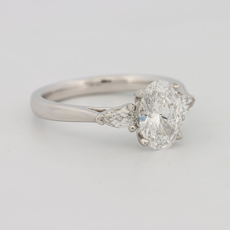 Сертифицирован IGI • Lab‑Grown (CVD) Овал 1.01 ct — D–E / VS1–VS2 • Натуральные Боковые Камни 0.25 ct — F / VS • 18K Белое Золото • 3.30g