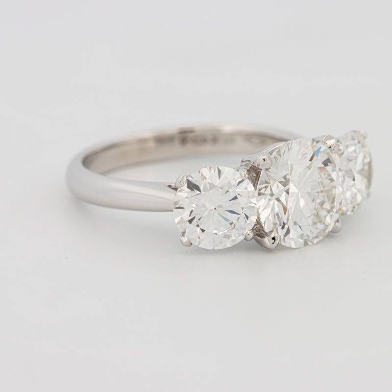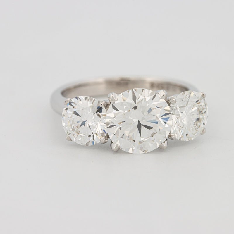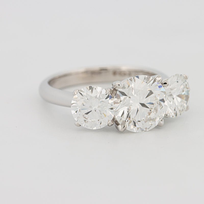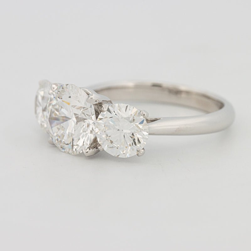 Впечатляющий F/VS1 lab‑grown круглый бриллиант идеально сбалансирован подобранными боковыми камнями D/VS1, создавая утончённый трёхкаменный силуэт с исключительным блеском.