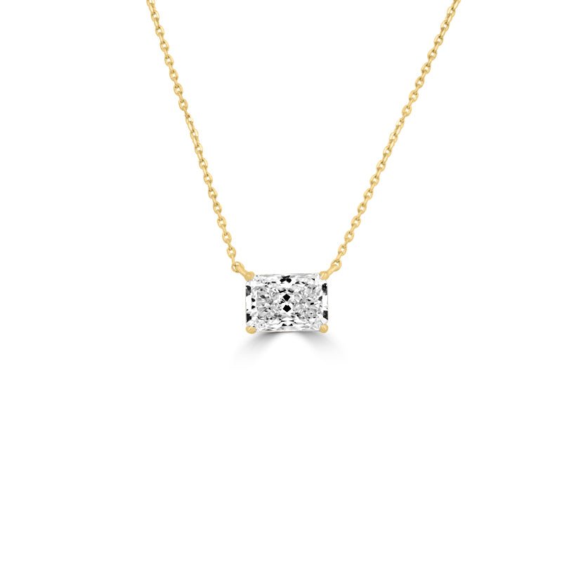Элегантная горизонтальная радиантная огранка в E–F/VS сочетает современные линии с блестящим сиянием для утонченного, повседневного акцента.