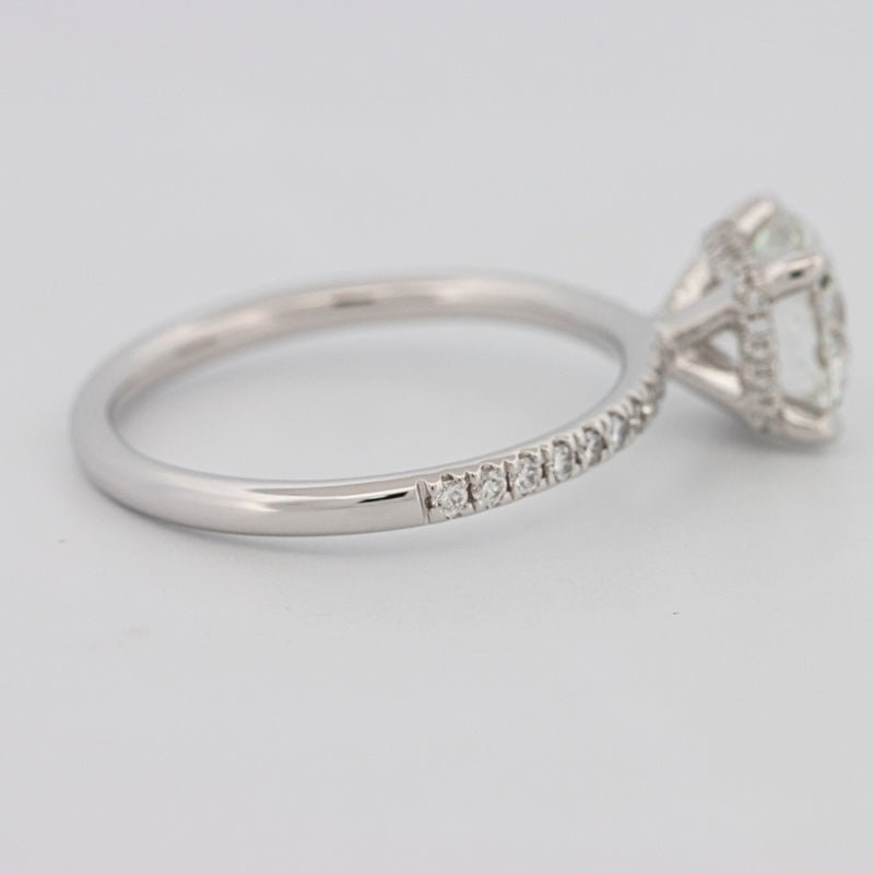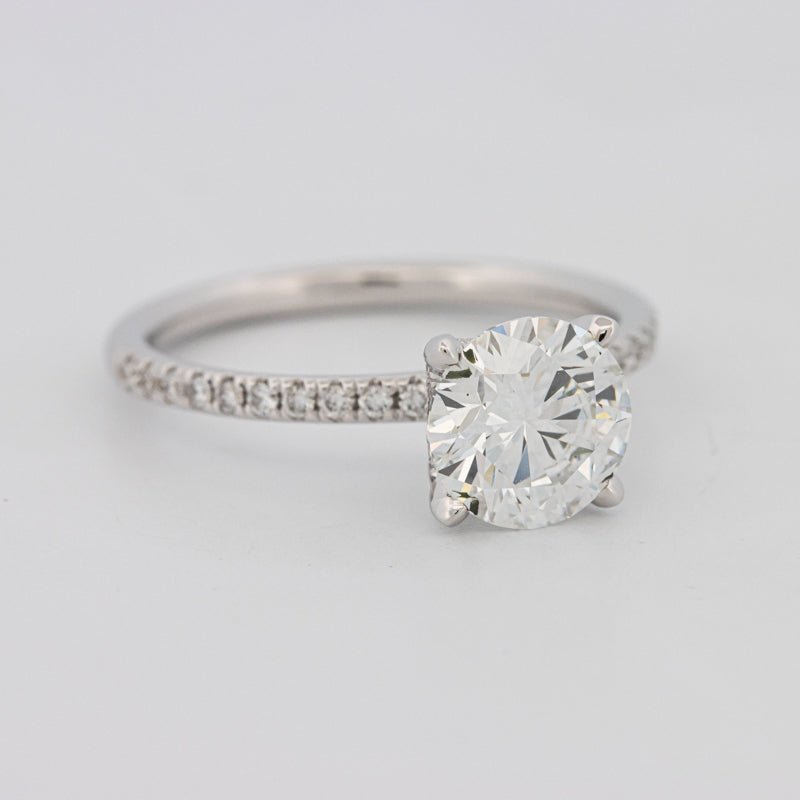 Элегантный солитер с под-ореолом и паве, демонстрирующий 1.56 ct сертифицированный IGI лабораторно выращенный круглый бриллиант в сияющем цвете E и утонченной чистоте VS1 для исключительного огня и симметрии.