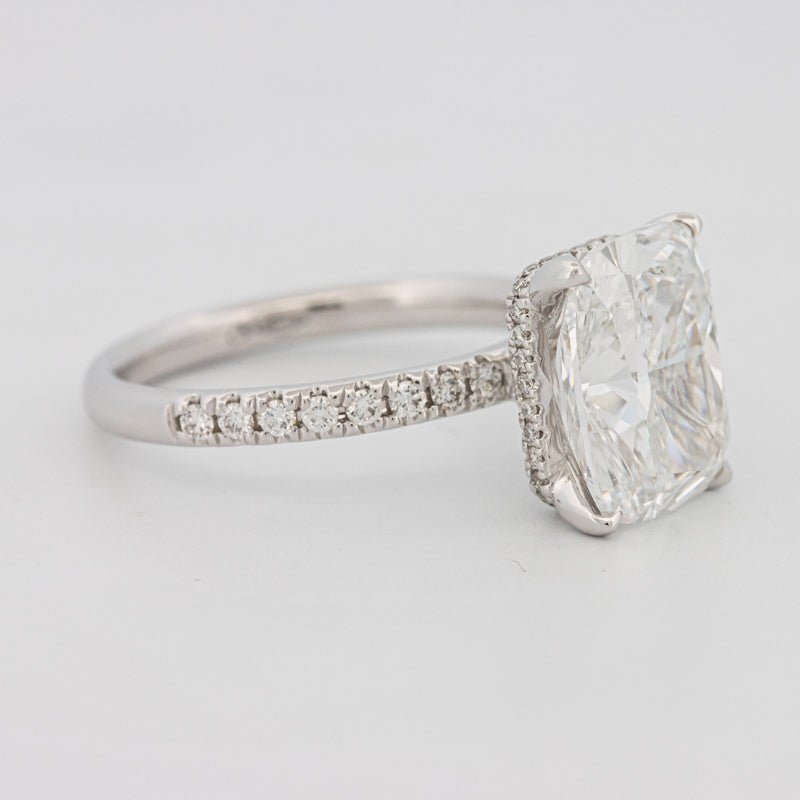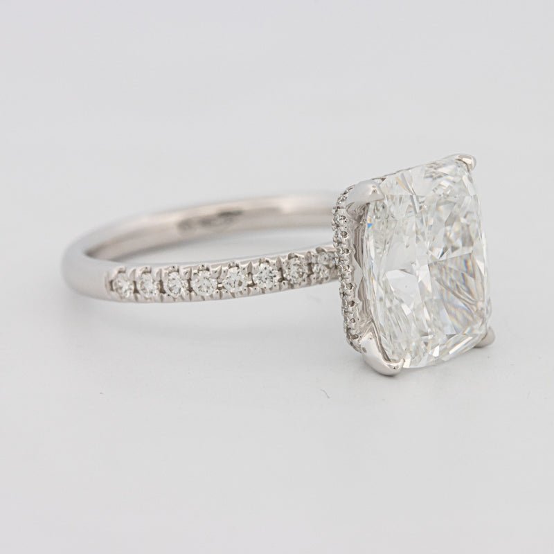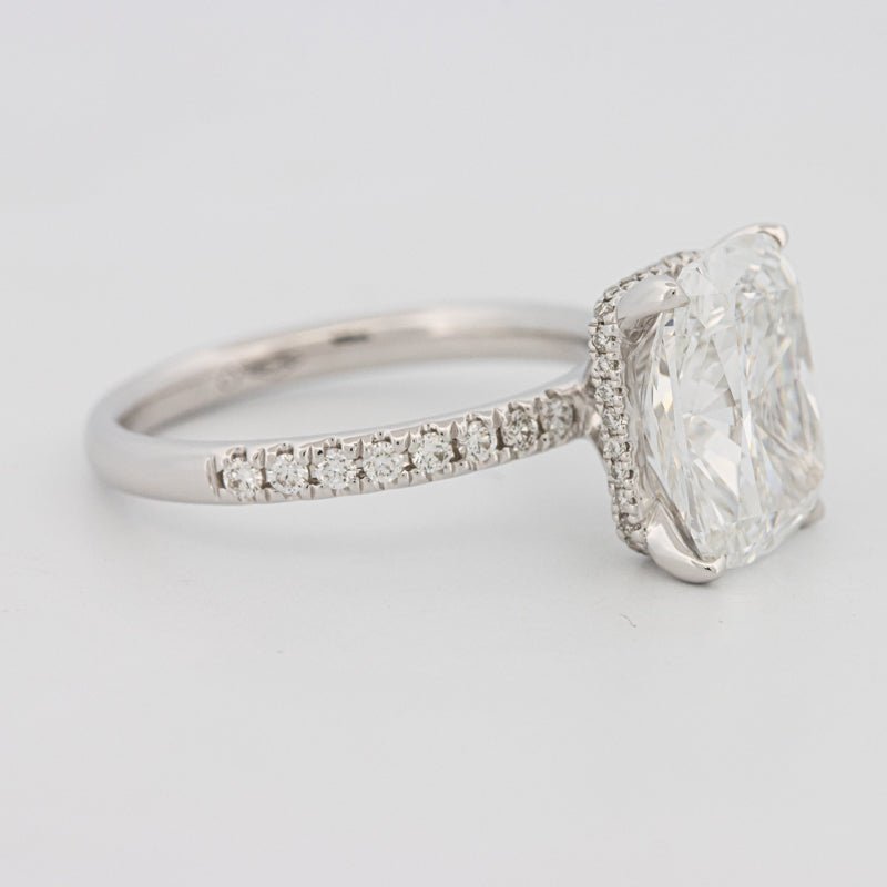 Сертифицировано IGI • Lab‑Grown Cushion 4.37 ct — F / VVS2 • Подгало Паве 0.50 ct — F / VS (Натуральные) • 18K Белое Золото • 3.40g