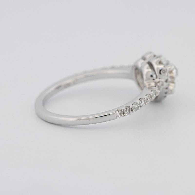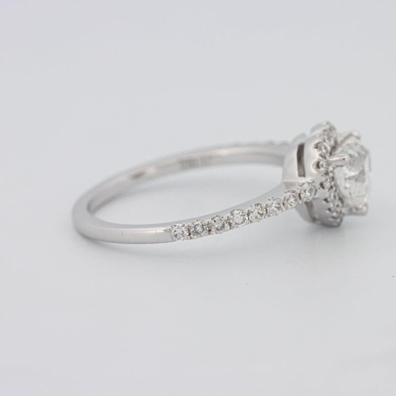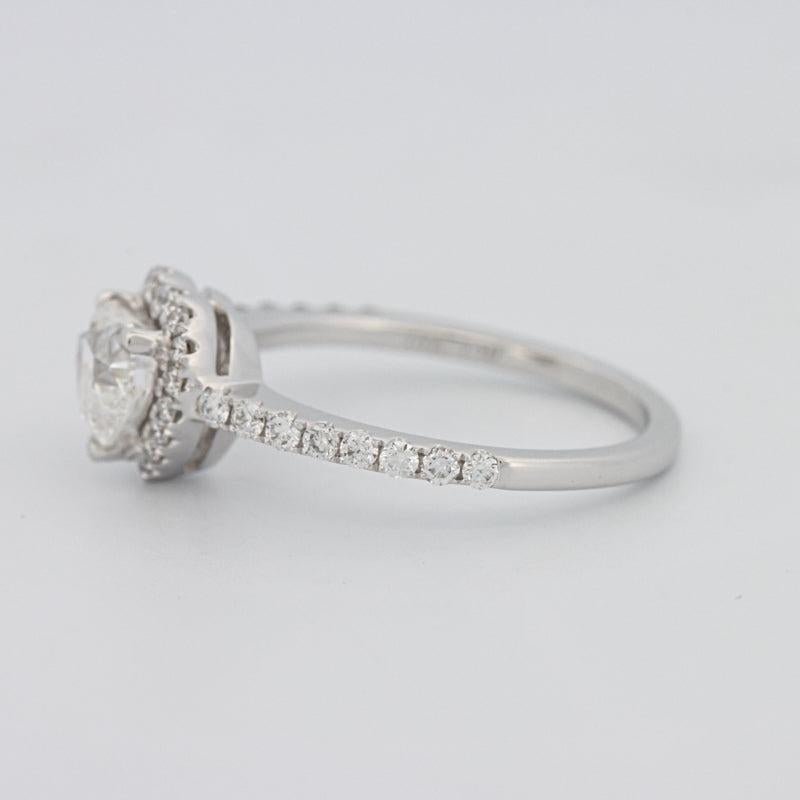 Një diamant qendror në formë zemre 0.91 ct F/SI1 i certifikuar nga HRD është i rrethuar nga një halo e ndritshme F/VS me një total prej 0.50 ct për simetri dhe shkëlqim rrezatues.
