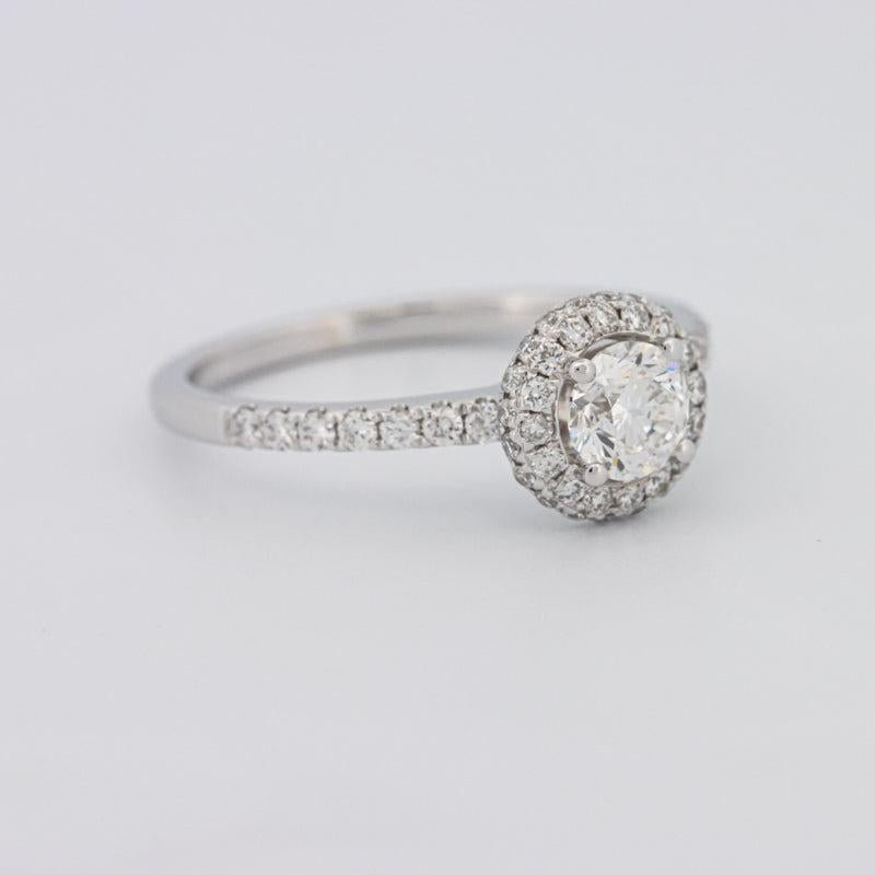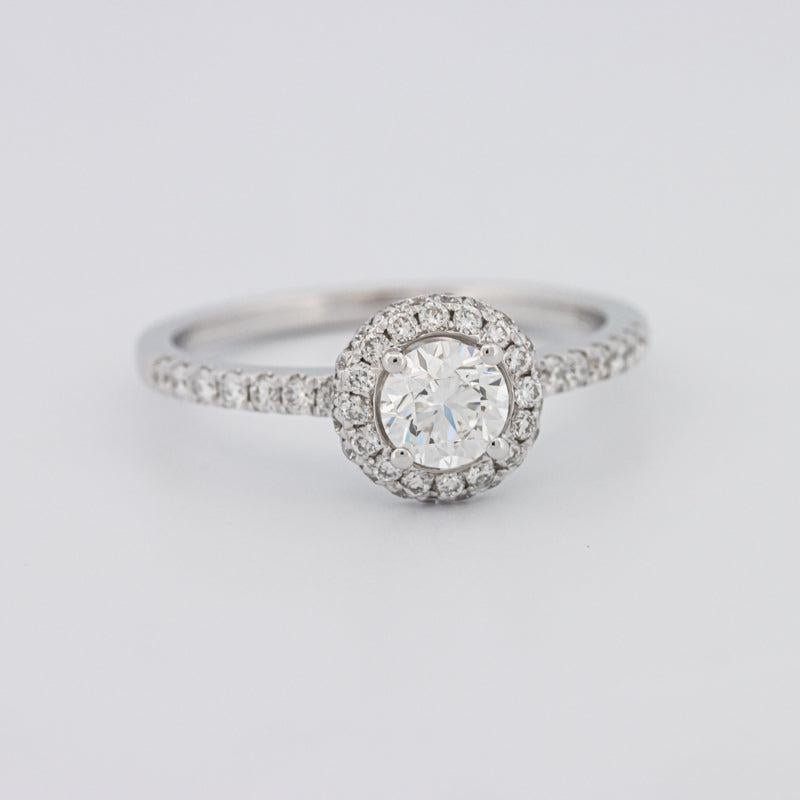 Nje brilant i rrumbullakët 0.50 ct i certifikuar nga GIA F/VVS1 është i rrethuar nga një mikro-halo E/VVS dhe brez pavé që arrin gjithsej 0.35 ct për një shkëlqim të vazhdueshëm.