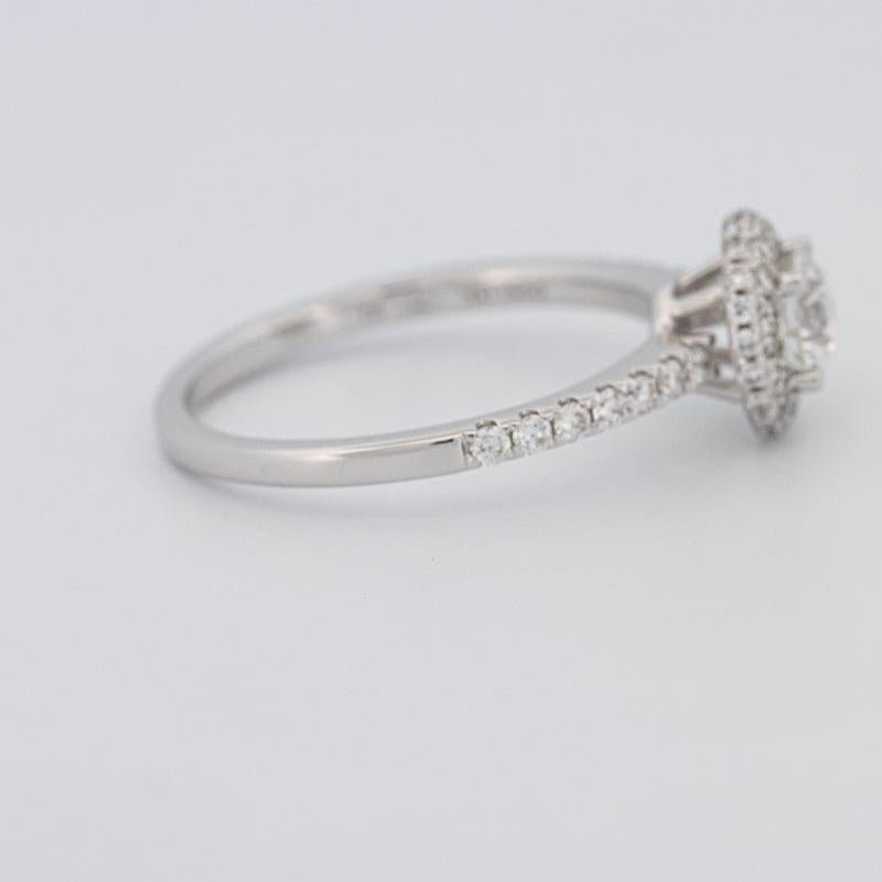 Punuar në ar të bardhë 18K (4.10g), kjo siluetë e rafinuar me halo përzien përmasat klasike me detaje moderne pavé—e krijuar për një elegancë të ndritshme të përditshme.