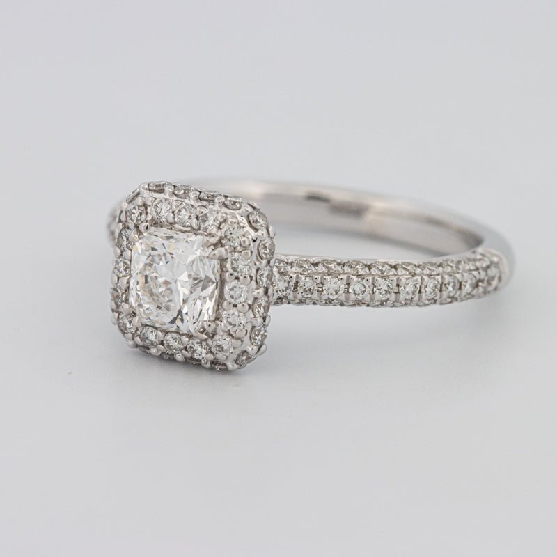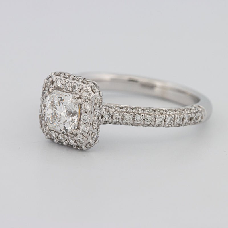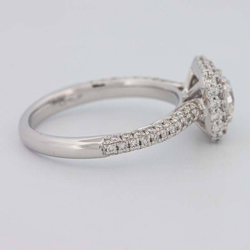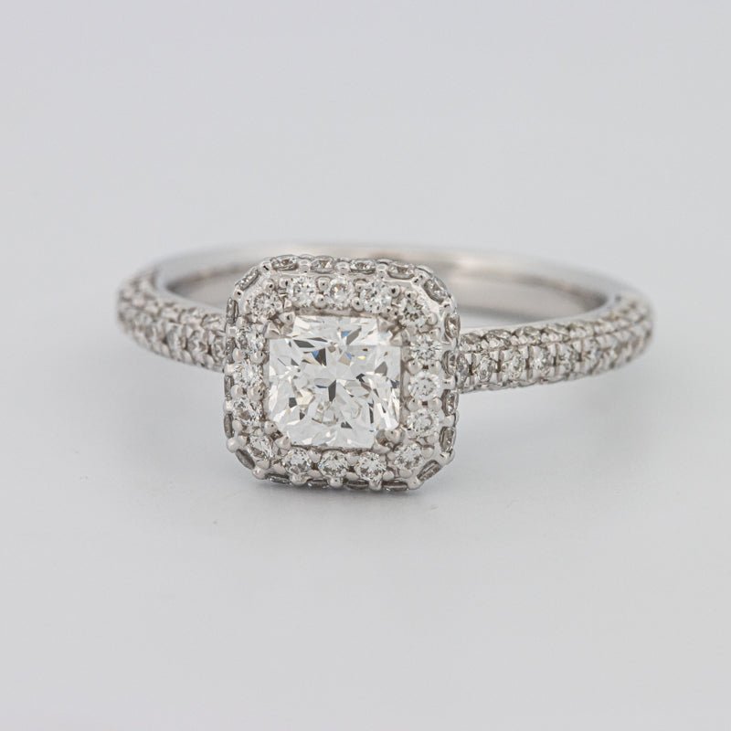 Nje shkëlqim katror 0.70 ct F/VVS1 i certifikuar nga HRD është i rrethuar nga një halo ndriçues, duke amplifikuar zjarrin modern dhe të pastër.