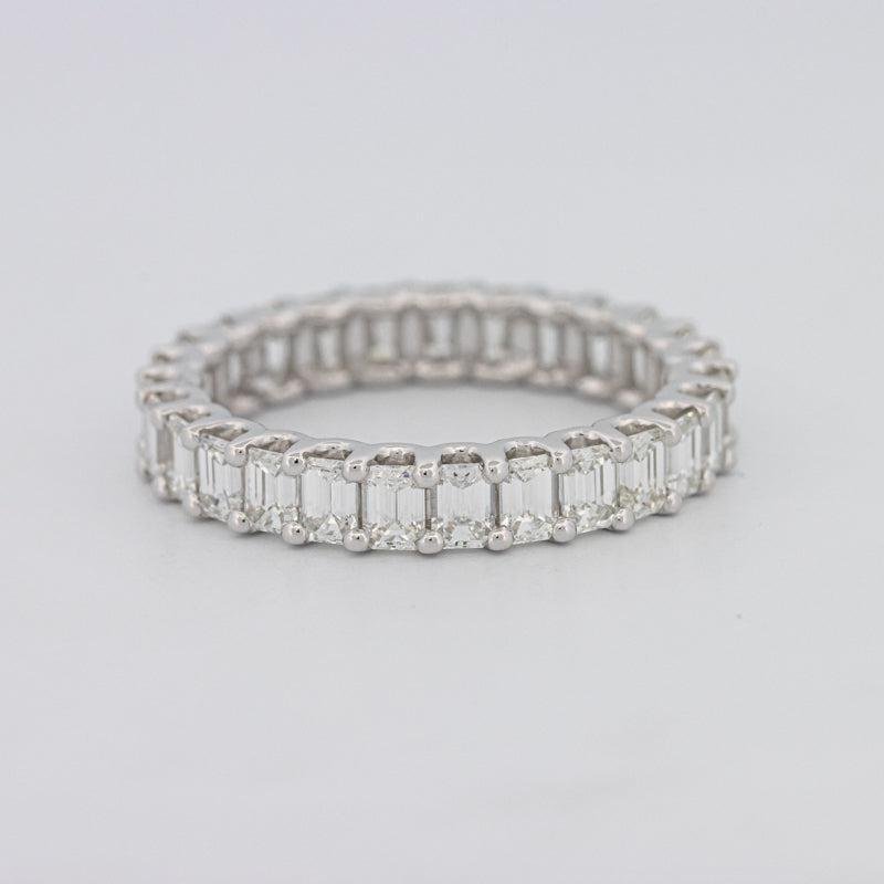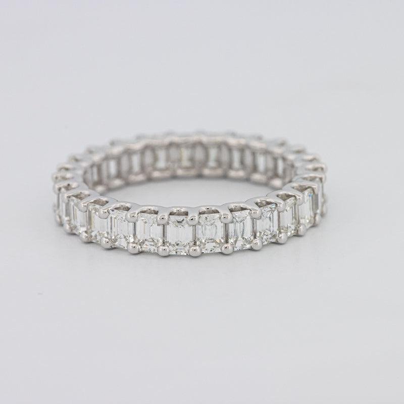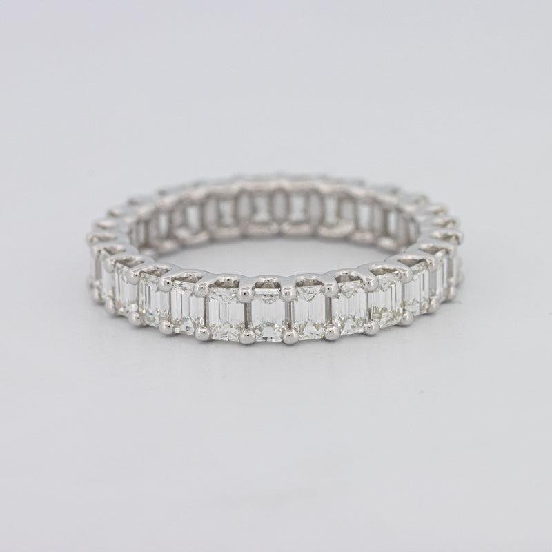 Nje rreth i vazhdueshëm me 27 diamante me prerje smeraldi, ngjyra F/G, qartësia VS, me një total prej 2.50 ct, ofron shkëlqim të rafinuar nga çdo kënd.