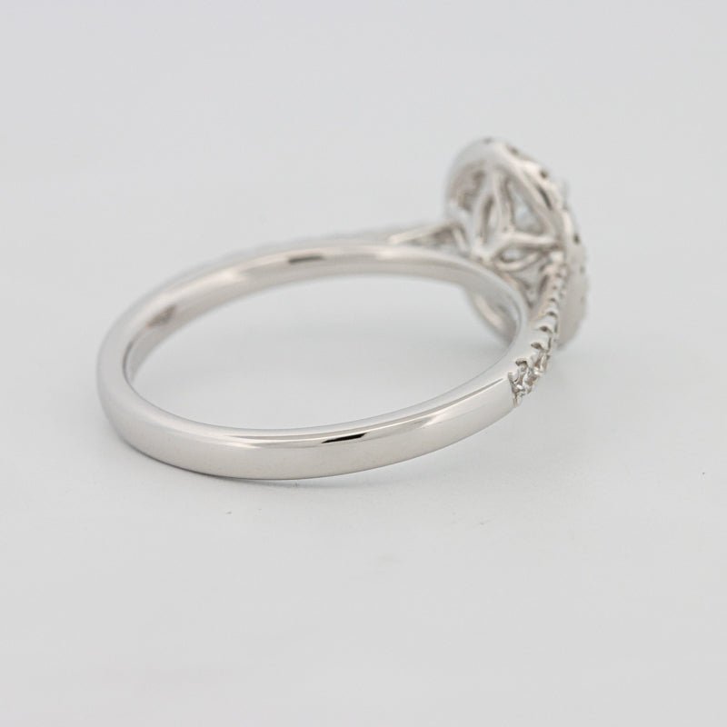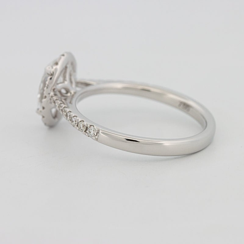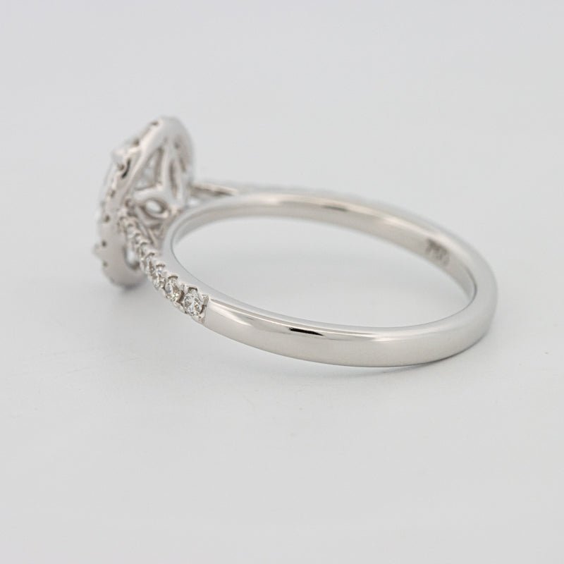 Punuar në ar të bardhë të lëmuar 18K (3.00g), ky halo pavé solitaire përzien elegancën e përjetshme me shkëlqimin modern dhe etik.