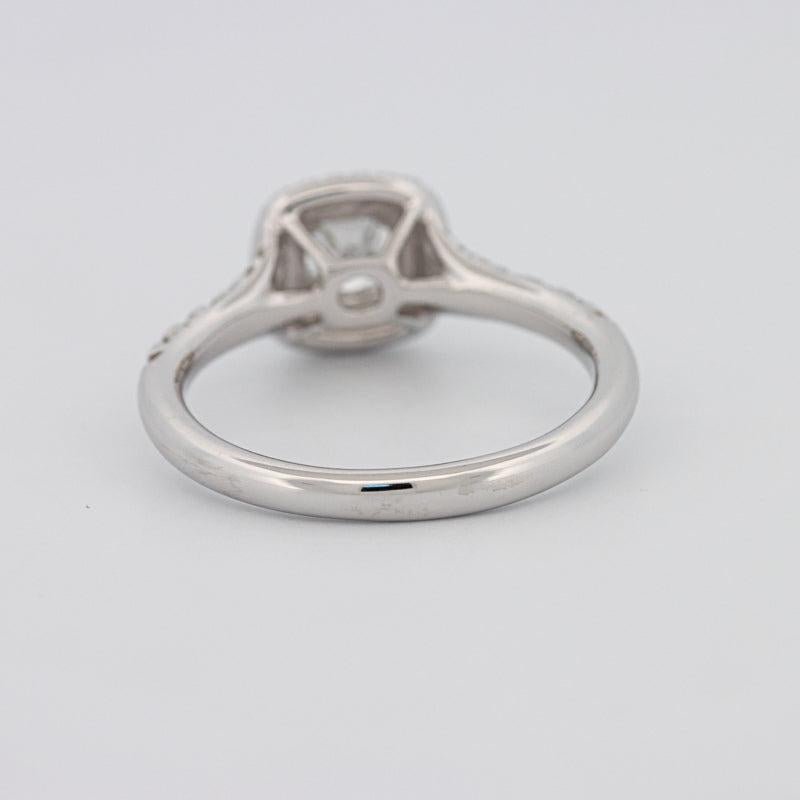Nje brilant rrethor 0.30 ct D/SI1 i certifikuar nga IGI është i rrethuar nga një dy halo ndriçuese, me diamantet anësore që arrijnë gjithsej 0.75 ct për shkëlqim të amplifikuar.