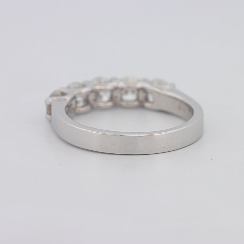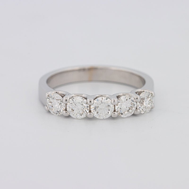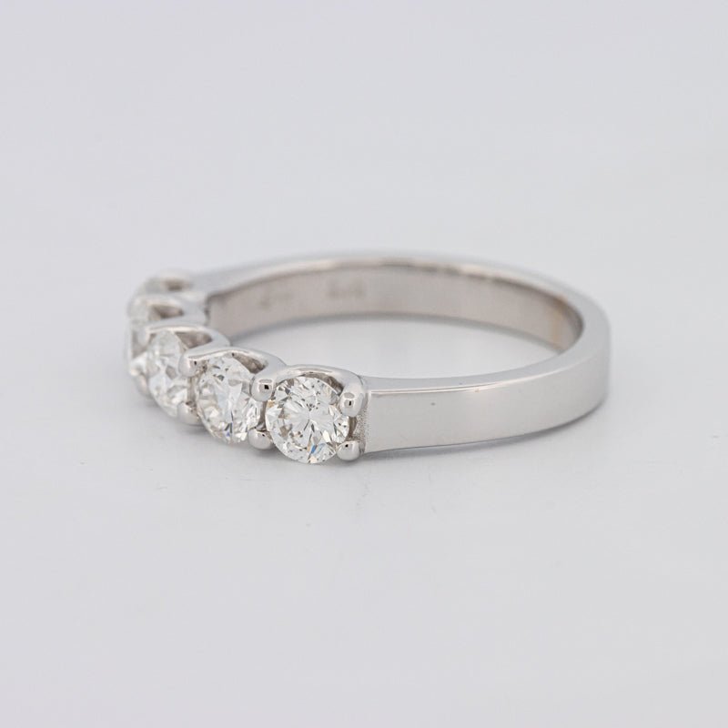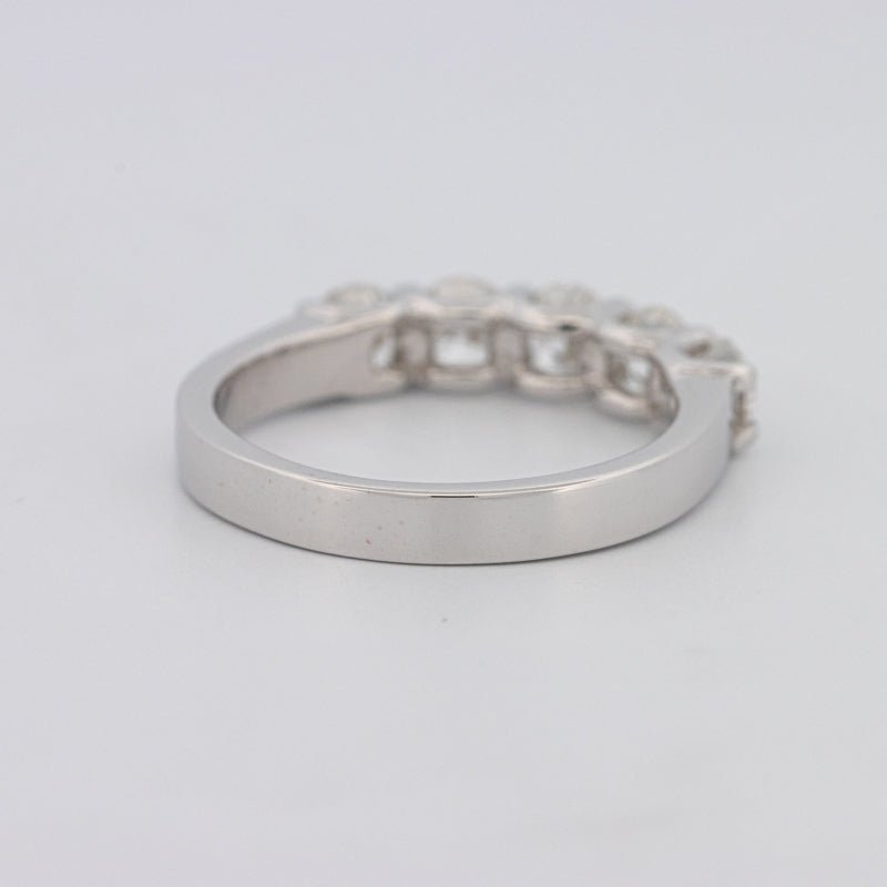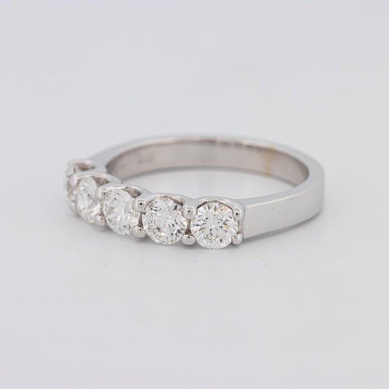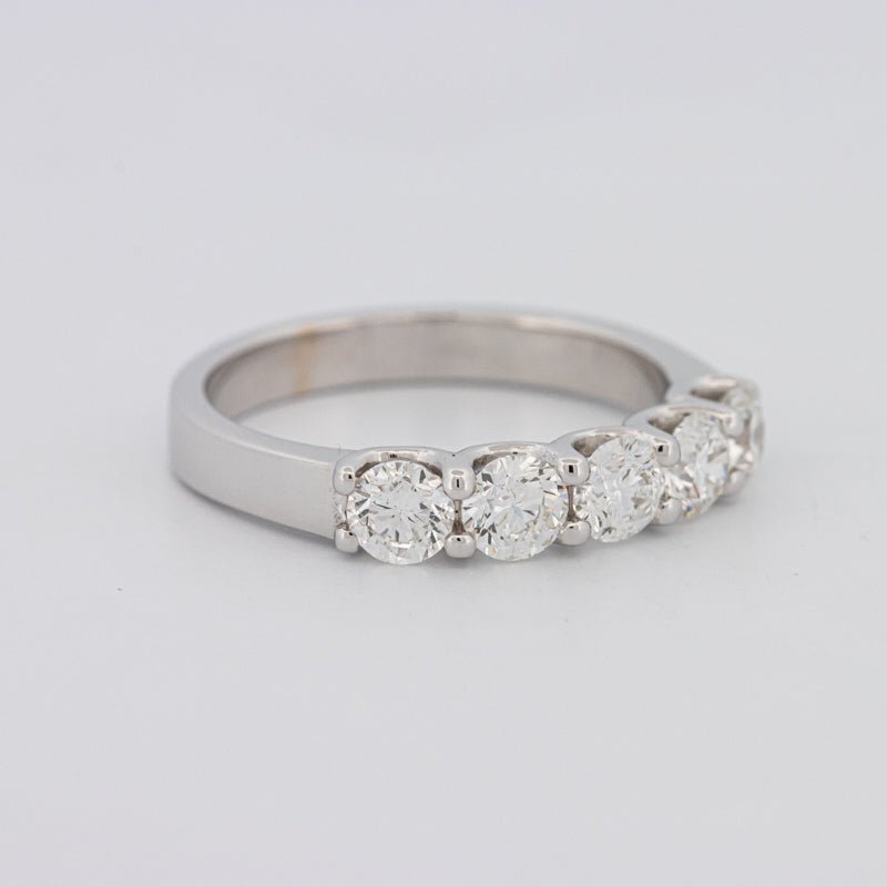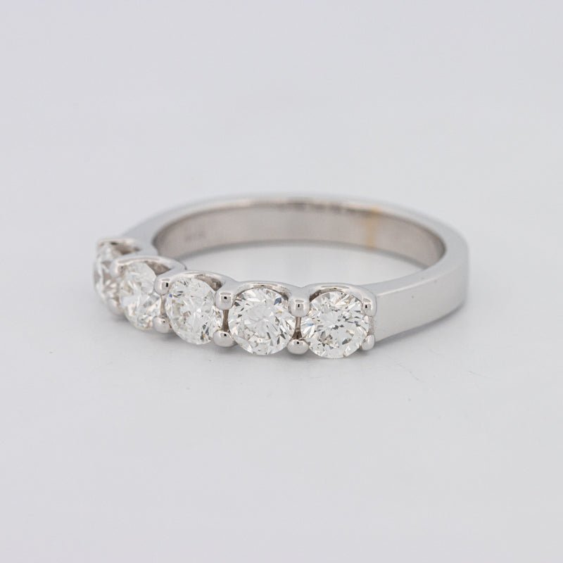 Pesë diamante të rrumbullakëta F/VS që totalizojnë 1.00 ct lundrojnë pa ndërprerje përgjatë bandës për shkëlqim të vazhdueshëm dhe simetri të rafinuar.