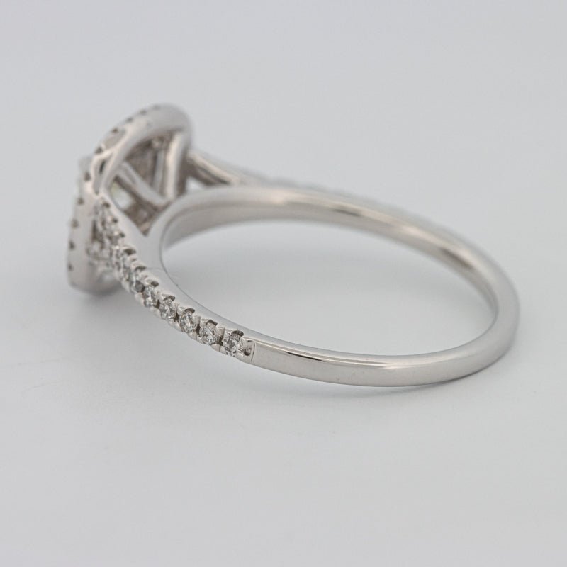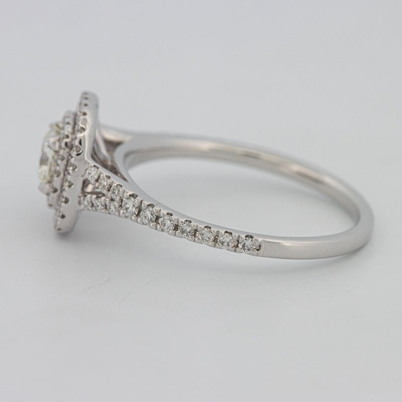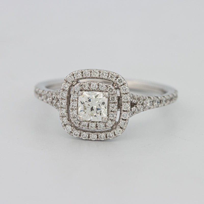 Një qendër radiant katror 0.34 ct H/VVS1 e certifikuar nga HRD është e rrethuar nga një halo ndriçuese, duke amplifikuar shkëlqimin dhe prezencën e rafinuar.