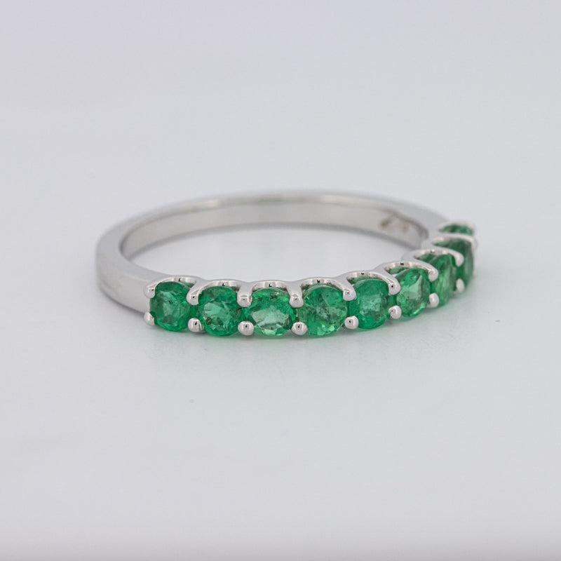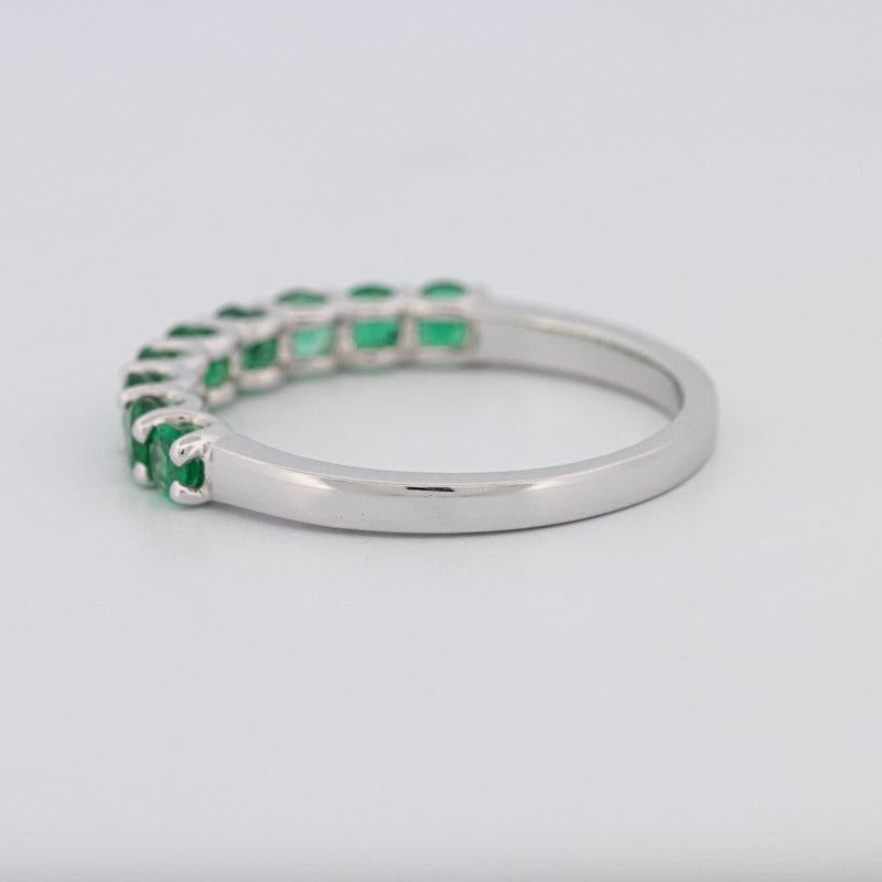 Një linjë e gjallë e smeraldëve të rekristalizuar me një total prej 1.05 ct sjell ngjyrë të gjelbër të harlisur dhe shkëlqim të rafinuar në pjesën e sipërme të unazës.