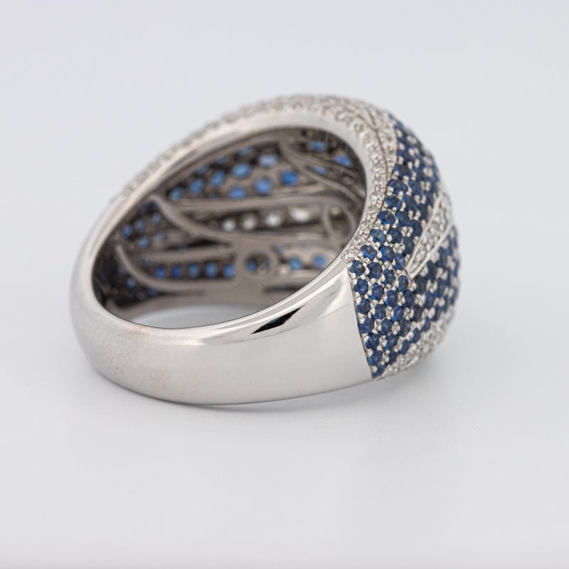 Nje valë rrjedhëse e safirëve blu natyral (1.15 ct) ndërthuret me 1.25 ct diamante F/VS për ngjyrë të gjallë dhe shkëlqim të qartë.