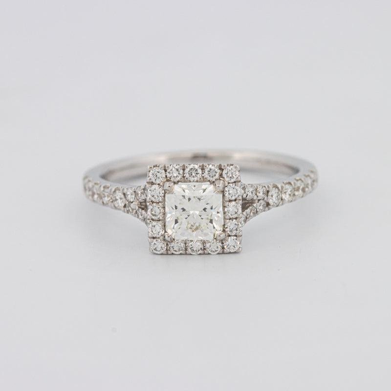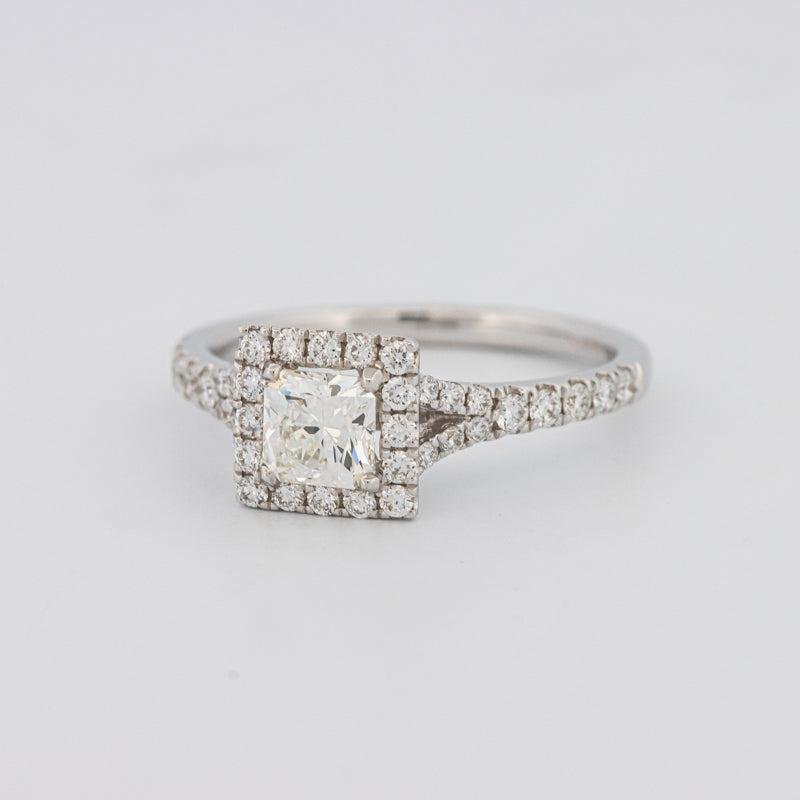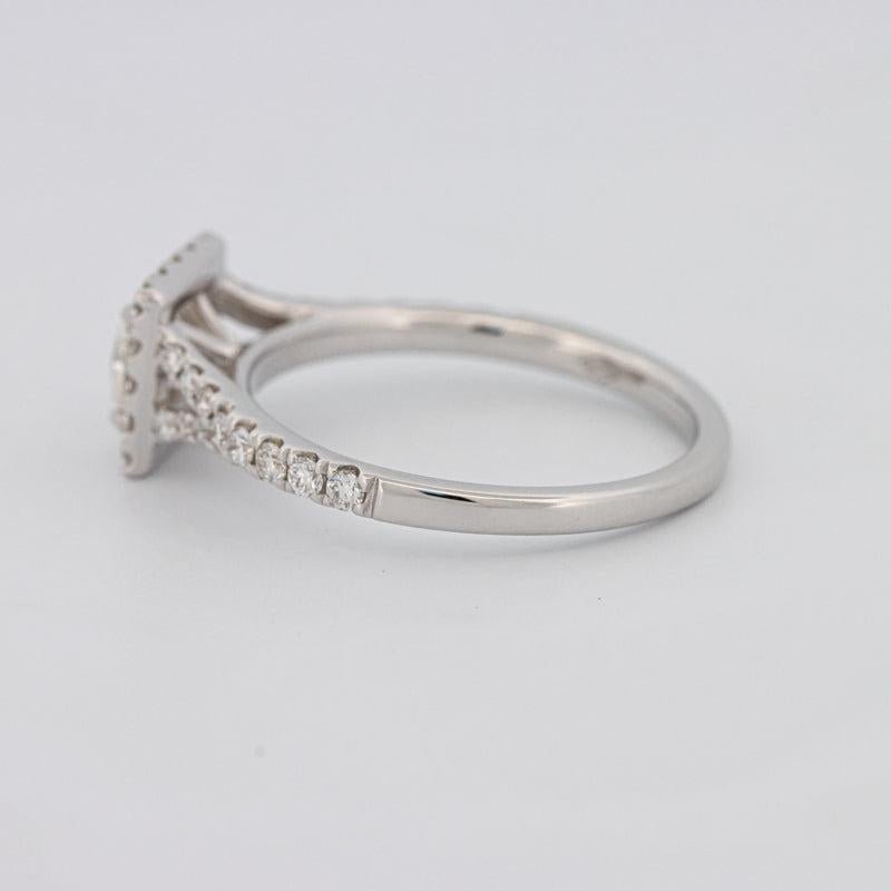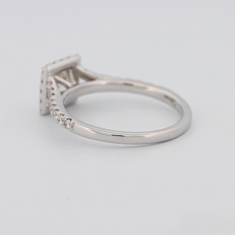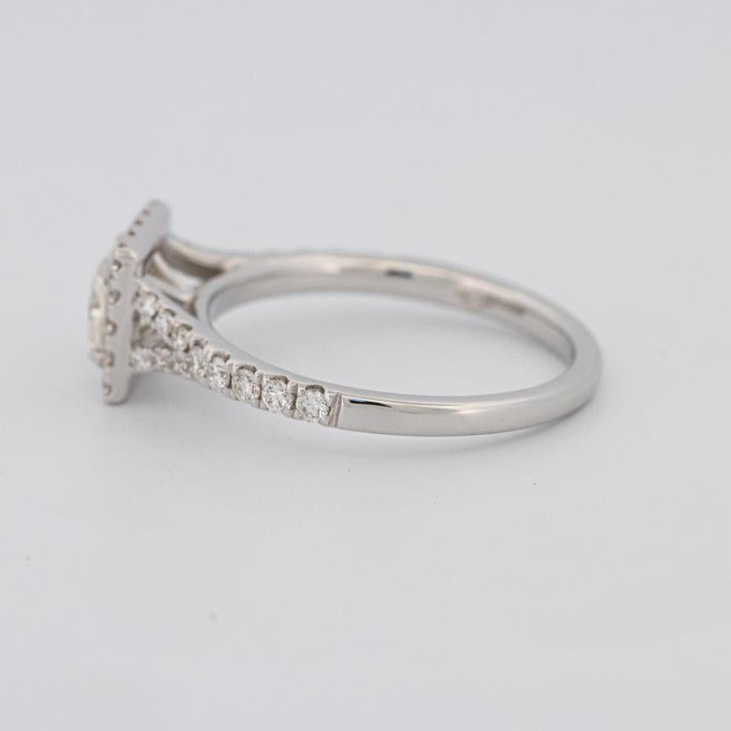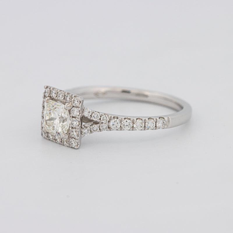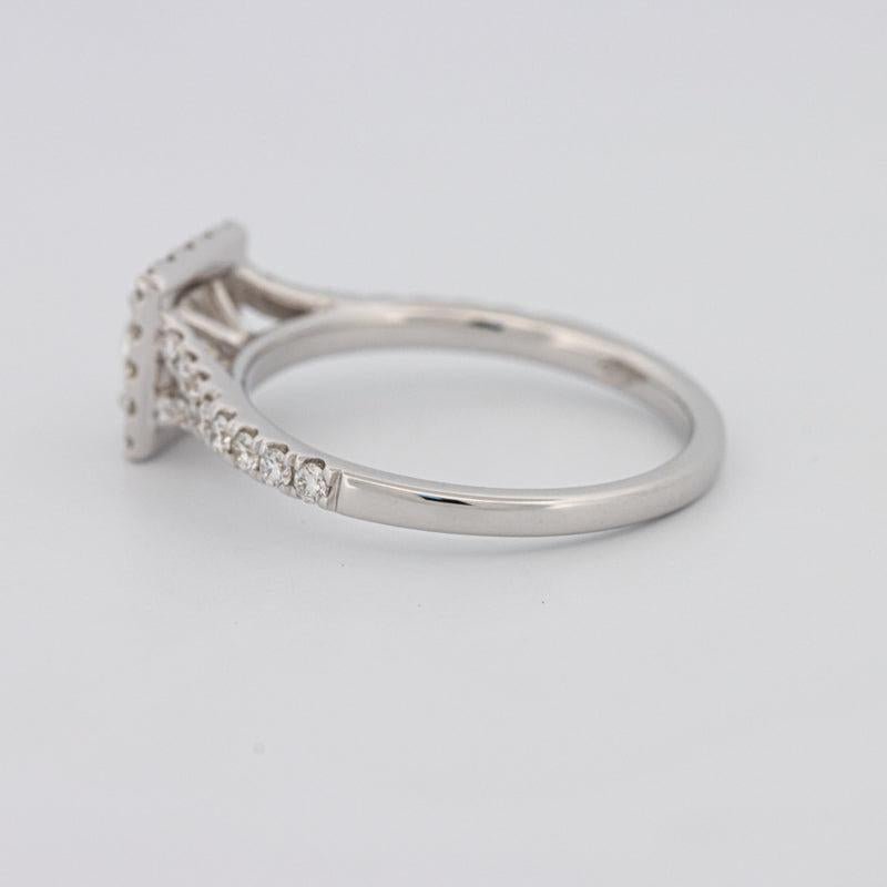 Një qendër rrezatimi katror 0.50 ct I/VVS2 e certifikuar nga HRD qëndron në qendër të halo-s, me aksente pavé që arrijnë gjithsej 0.65 ct për një shkëlqim të rafinuar dhe të vazhdueshëm.