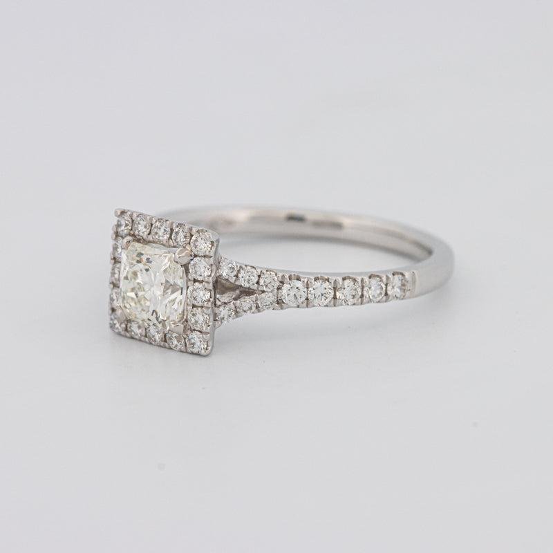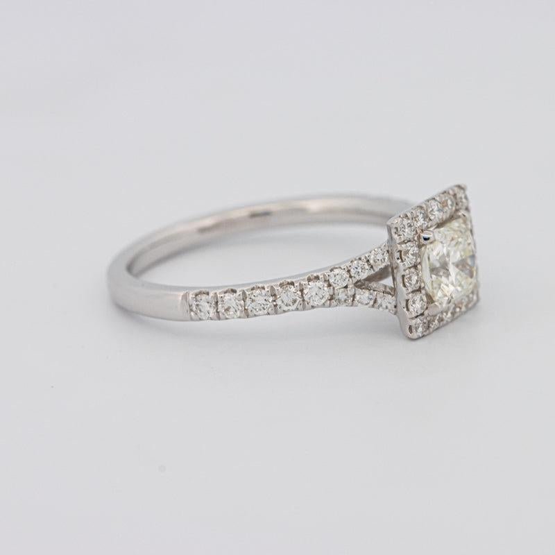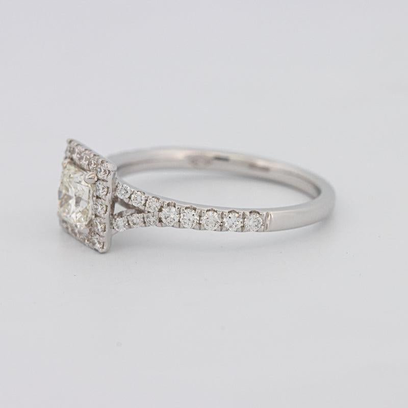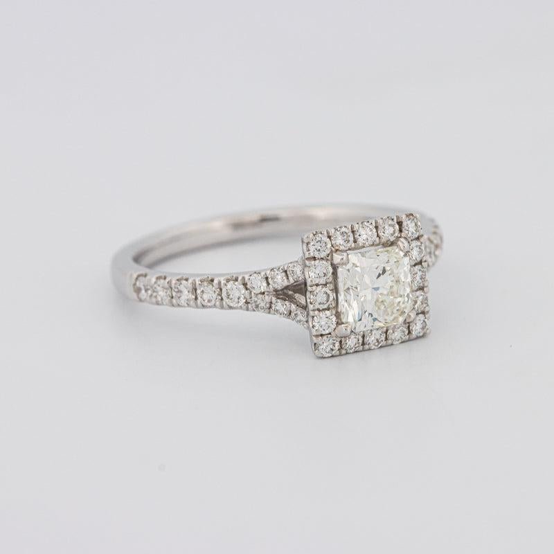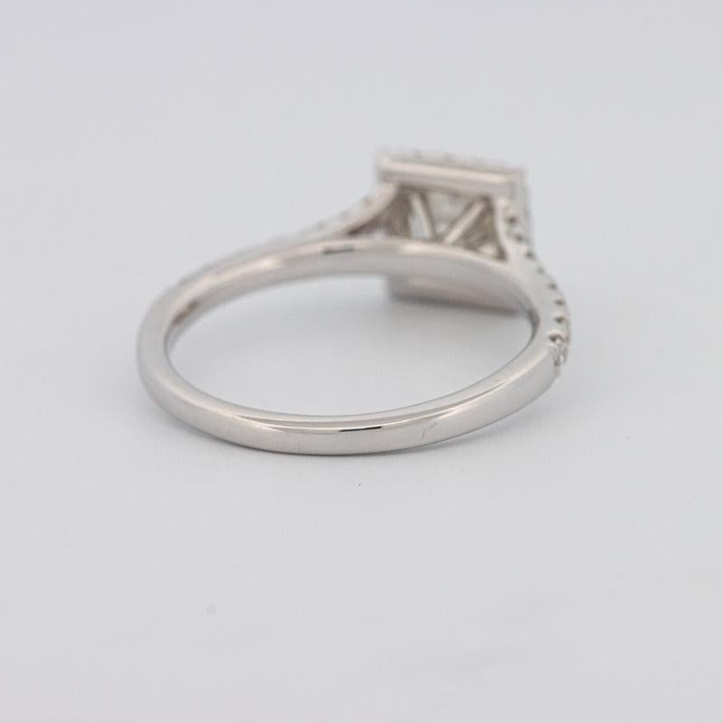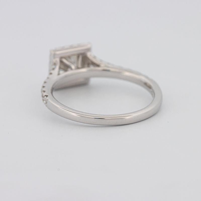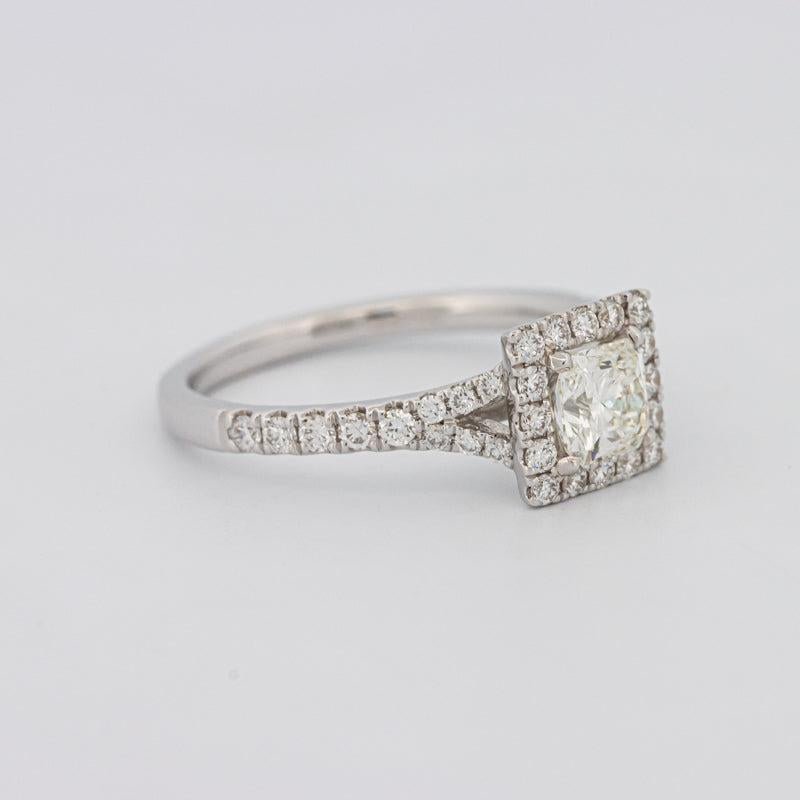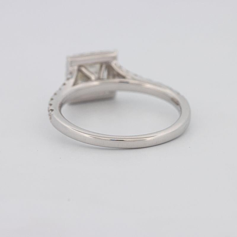 Një qendër rrezatimi katror 0.50 ct I/VVS2 e certifikuar nga HRD qëndron në qendër të halo-s, me aksente pavé që arrijnë gjithsej 0.65 ct për një shkëlqim të rafinuar dhe të vazhdueshëm.