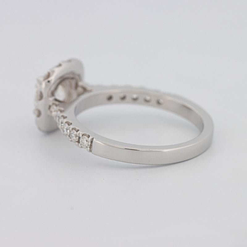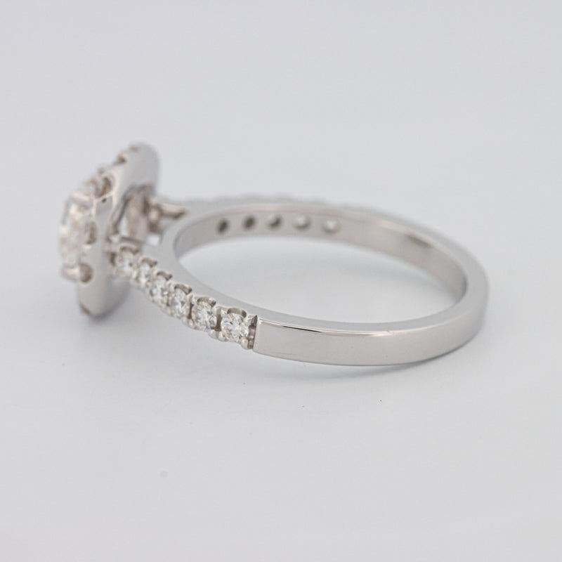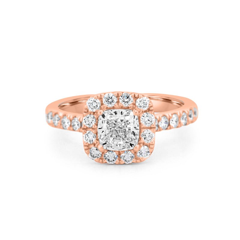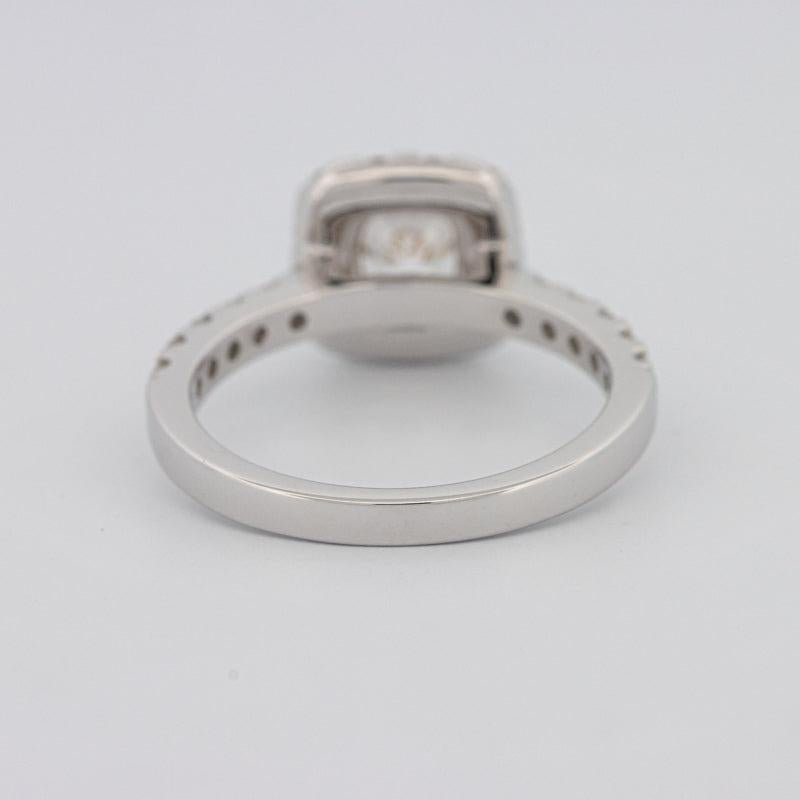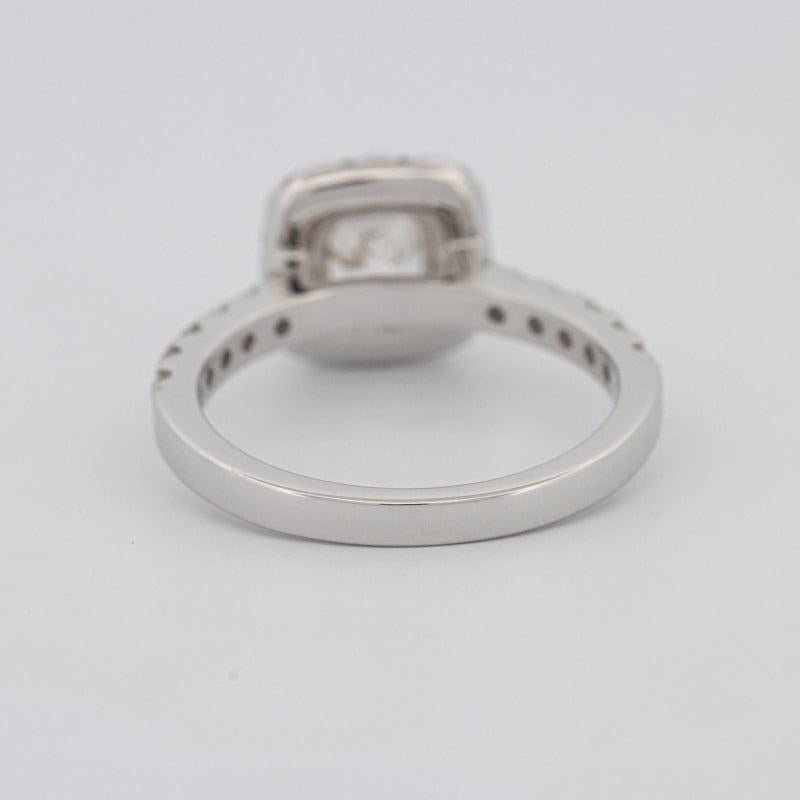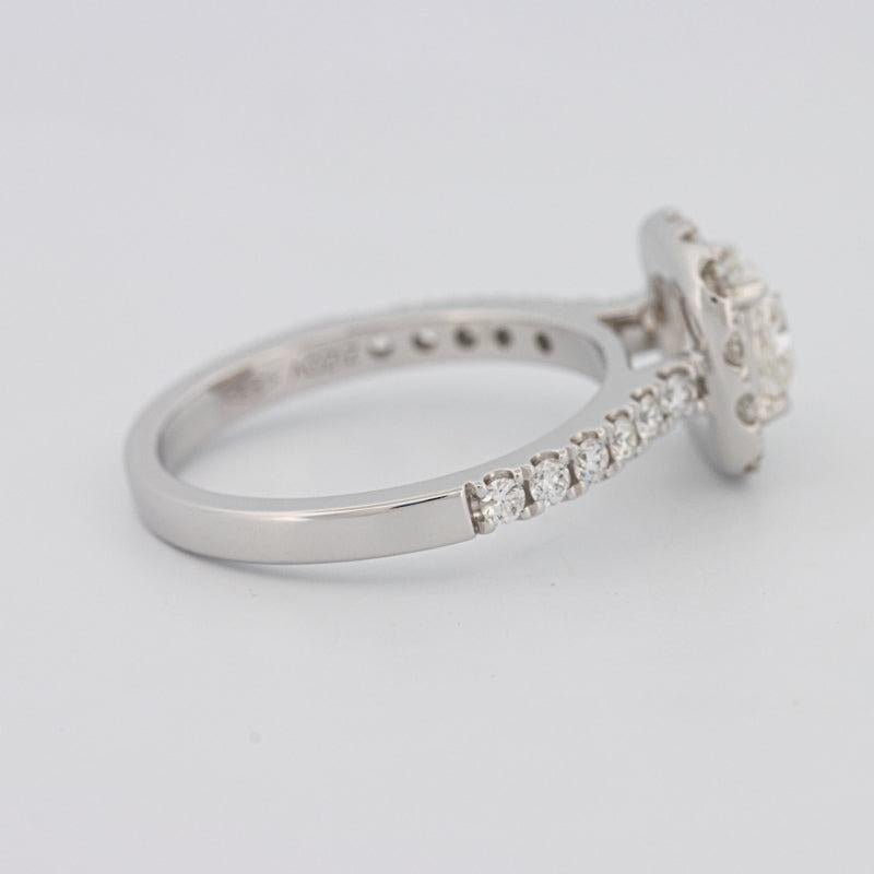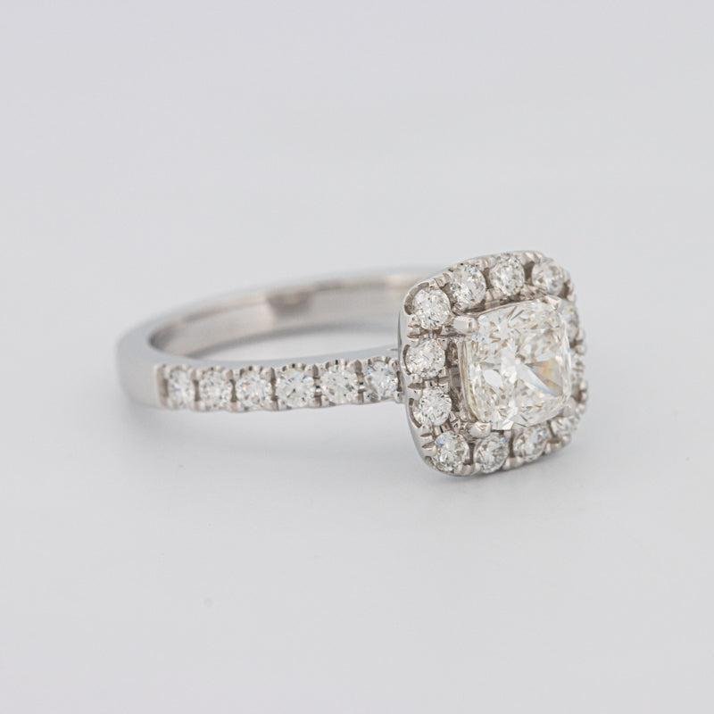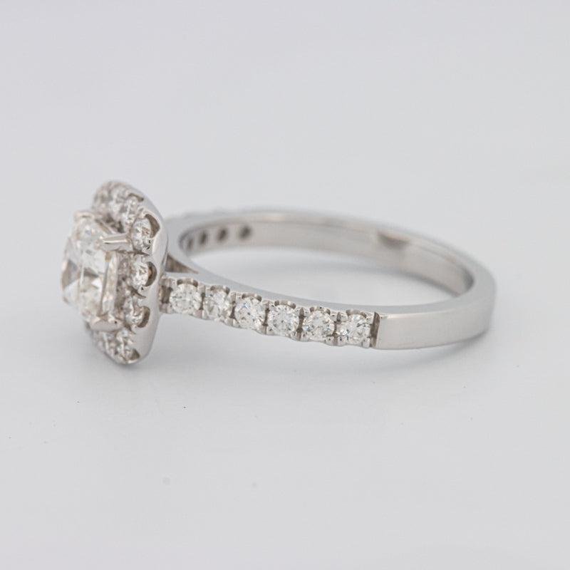 Një qendër rrezatimi katror 0.91 ct G/VVS1 e certifikuar nga GIA, e rrethuar nga një halo ndriçuese, e plotësuar nga pavé F/VS me total 0.75 ct për një shkëlqim të balancuar dhe të lartë.
